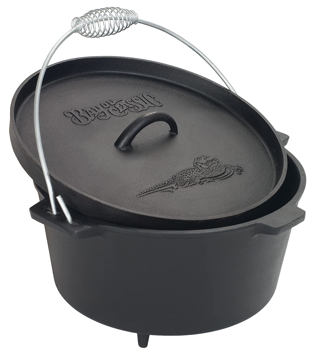 Bayou Classic Pre-Seasoned Cast Iron Dutch Oven w/ Feet Features Flanged Camp Lid Stainless Coil Wire Handle Grip, 8-qt Perfect For Baking Frying One-Pot Meals Stews and Chili