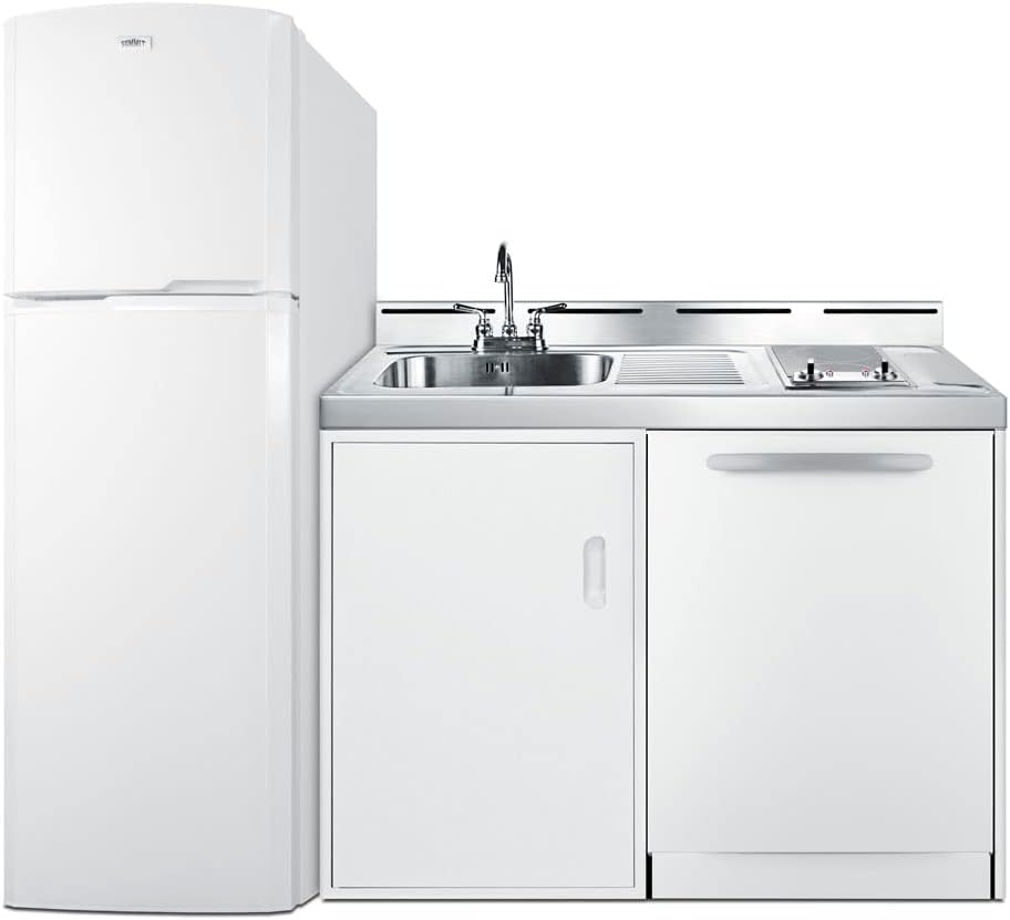 All in one, perfect for your space: Complete kitchen functionality with a full-sized refrigerator-freezer, smooth glass 2-burner cooktop, European dishwasher, and sink. Also includes a stainless steel countertop and large cabinet with a removable shelf for added storage convenience. The...