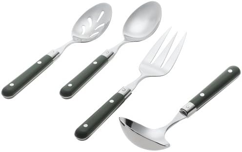 Designed and made for everyday useSet includes a Solid Serving Spoon, Pierced Serving Spoon, Cold Meat Fork and Sauce LadleMade from 18/0 stainless steel with high-end engineered plastic handlesDishwasher SafeMade in China